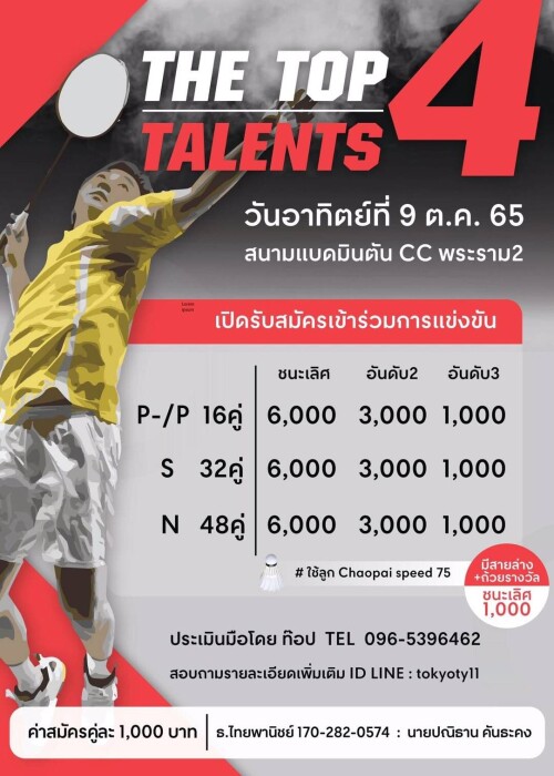 - ค่าสมัครเข้าร่วมการแข่งขันคู่ละ : 900 บาท / เยาวชน 500 บาท