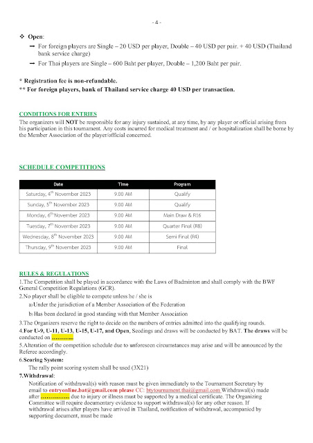 ➢ รุ่นอายุ U-13, U-15, U-17 ประเภทเดี่ยว 500 บาท ประเภทคู่ 1,000 บาท