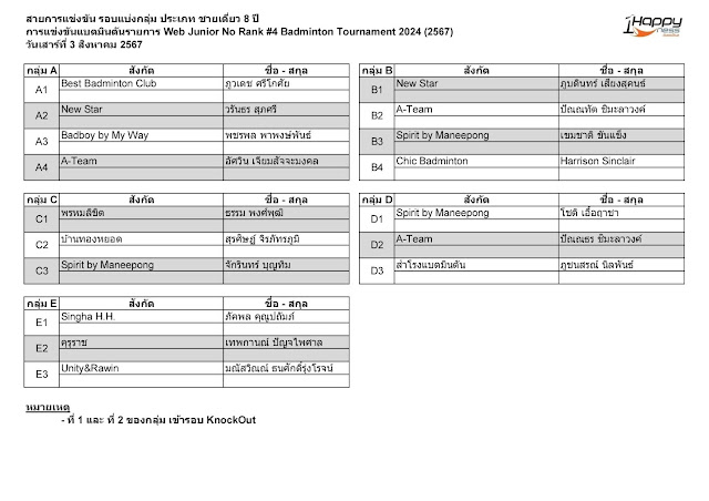 - กรณีคะแนน Head to Head เท่ากันให้ทำการแข่งขันใหม่ 1 เกม 21 แต้มไม่มีดิวส์ (หรือ ใช้วีธีจับฉลาก)
