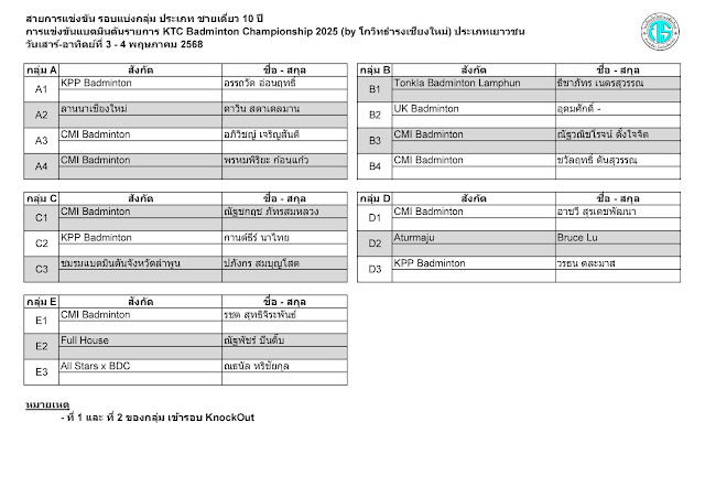 - กรณีคะแนน Head to Head เท่ากันให้ทำการแข่งขันใหม่ 1 เกม 21 แต้มไม่มีดิวส์ (หรือ ใช้วีธีจับฉลาก)