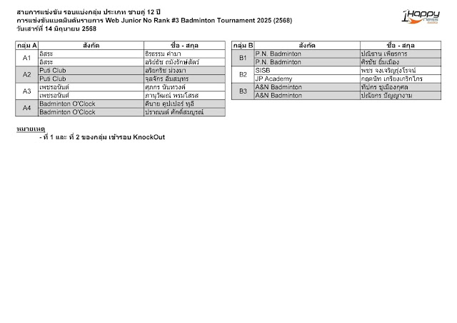 - กรณีคะแนน Head to Head เท่ากันให้ทำการแข่งขันใหม่ 1 เกม 21 แต้มไม่มีดิวส์ (หรือ ใช้วีธีจับฉลาก)